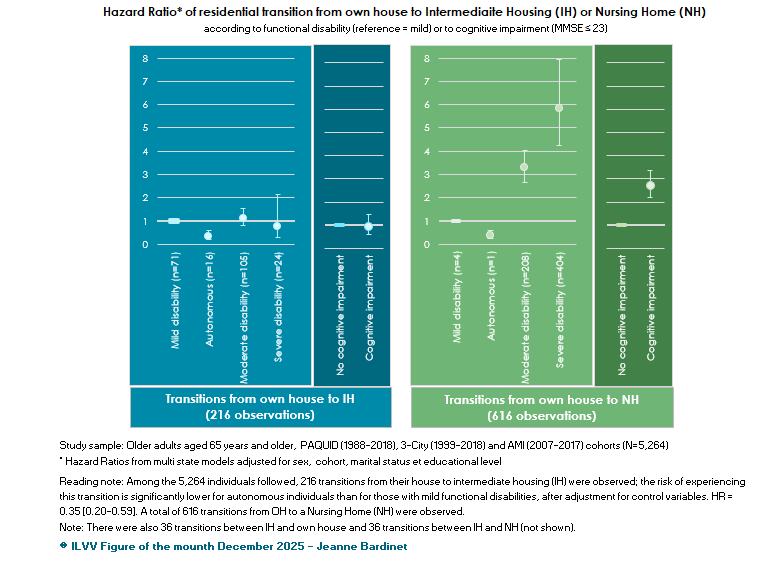 The average probability of moving out own's house is estimated at 16% over the study period: more often for a NH (12%) than for IH (4%). Cognitive impairment increases the probability of moving into NH, but not into IH. Autonomous people rarely move into NH, and significantly less than people with mild disability; but compared with the latter, the probability is three times higher with moderate disability and six times higher with severe disability. Moving into IH is also less likely for autonomous people than for those with mild disability; transitions are slightly more frequent with moderate disability and slightly less with severe disability (not statistically significant).